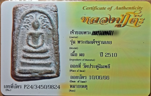 พระสมเด็จปรกโพธิ์ฐานเกย มวลสารที่ใช้ได้แก่ องค์พระที่แตกหักจากพระเนื้อผงชุดแรก กล้วยน้ำว้าดิบๆ ปูนขาว และน้ำมันตังอิ๊วผสมลงไปด้วย ........องค์ที่นำลงในชมรมสภาพสวย หนา โพธิ์ชัดเจนมาก องค์นี้มวลสารเยอะมาก***ติดรางวัลที่ 1 เมื่อวันอาทิตย์ที่ 3 ธันวาคม 2566 มหกรรมการประกวดการอนุรักษ์ พระบูชา พระเครื่องฯลฯ ณศูนย์การค้าพันธุ์ทิพย์บางกะปิ ใบประกาศต้องรอประมาณ 40 วัน