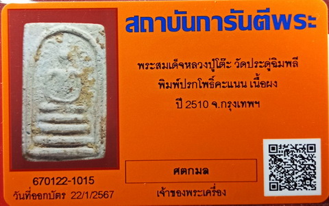 พระสมเด็จคะแนนพิมพ์นี้ ตามประวัติว่ากันว่า หลวงปู่ไม่ค่อยจะแจกให้กับใครง่ายๆ นอกจากลูกศิษย์ที่ใกล้ชิดเท่านั้น ต่อมามีคนรู้จักพระพิมพ์นี้มากขึ้น และไปเผ้ารบเร้าขอพระสมเด็จพิมพ์นี้จากหลวงปู่บ่อยๆ ท่านก็เลยแจกให้กับคนที่อยากได้จริงๆ เท่านั้น.. ( ข้อมูลจากหนังสือคุณประสิทธิ์ ปริชาน ).ขนาดองค์พระกว้าง 1.3 ซม. สูงประมาณ 2 ซม....( พระสมเด็จพิมพ์นี้ของแท้หายากมากๆ ).............องค์ที่นำลงในชมรม องค์จริงพระสวย มีคราบน้ำมนต์ เห็นก้านโพธิ์ชัด สีสวย พระเกศชัดถึงปลายยอด ซุ้มองค์พระเรียบร้อยดี ***รับประกันพระสภาพเดิมผิวพระเดิมมาก ผิวไม่ช้ำจากการสัมผัส ไม่มีอุดซ่อม หรือแต่งผิว ไม่มีบิ่นกระเทาะ หาสภาพเดิมผิวเดิมอย่างนี้ยากมาก