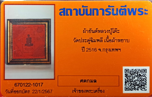 เป็นผ้ายันต์ที่ไม่ค่อยพบเห็น เป็นผ้ายันต์ที่หายาก ทันหลวงปู่ปลุกเสก มีทั้งสีขาว และสีแดง จุดในการพิจารณาต้องดูและจดจำลายผ้า ลักษณะการทอ ความถี่ ความห่าง ขนาดของเส้นด้าย เป็นหลักในการพิจารณา แยกแยะเก๊-แท้ ........ผืนที่นำลงในชมรมเป็นผ้ายันต์ รูปเหมือนหลวงปู่โต๊ะสังฆาฏิยาวสีแดง สภาพสวยสมบูรณ์มาก รุ่นนี้ถ้าเป็นสีแดงจะหายาก และจะสกรีนเป็นเงาดำ ไม่เห็นว่าเป็นหน้าของหลวงปู่อย่างชัดเจน สภาพสวยสมบูรณ์มาก