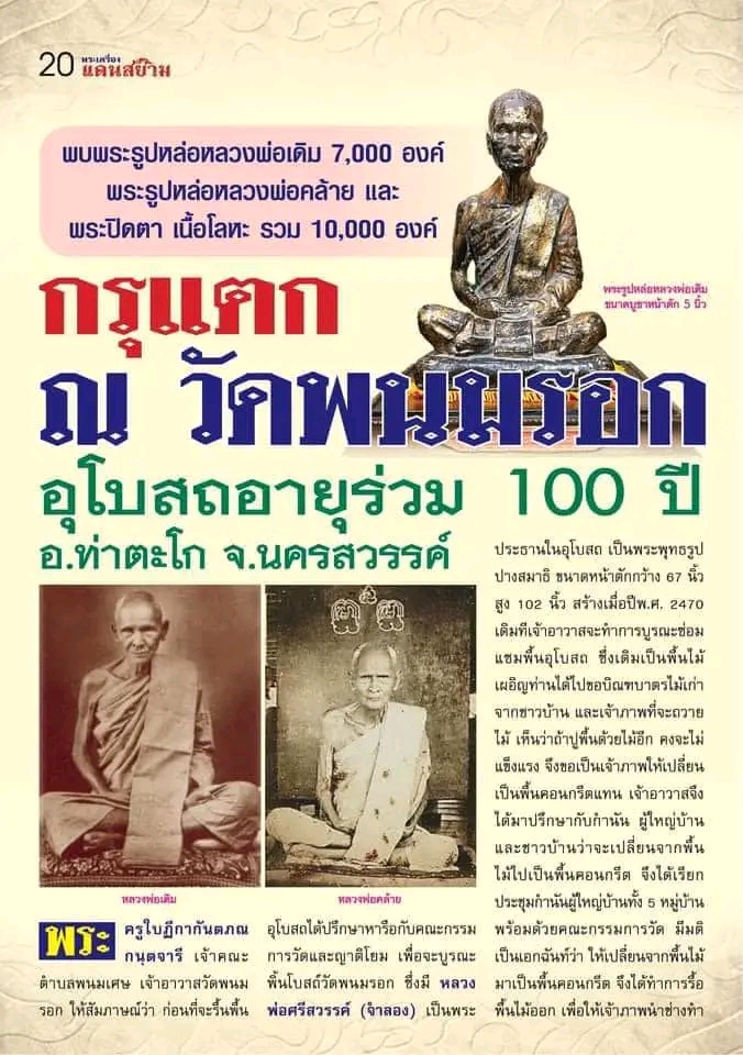 | รูปหล่อ หลวงพ่อเดิม วัดหนองโพ กรุวัดพนมรอก ฐานสูง(พิมพ์ใหญ่) เนื้อทองผสม กรุหลวงพ่อเดิม - หลวงพ่อคล้าย วัดพนมรอก ต.พนมรอก อ.ท่าตะโก จ. นครสวรรค์ เป็นวัดราษฎร์ สังกัดคณะสงฆ์มหานิกาย ตั้งอยู่ที่หมู่ที่ 4ตำบลพนมรอก อำเภอท่าตะโก จังหวัดนครสวรรค์ ก่อตั้งเมื่อปีพ.ศ. 2435 ได้รับพระราชทาน วิสุงคามสีมา พ.ศ. 2471 ซึ่งมีพระครูใบฎีกากันตภณ (หลวงพี่นะโม) ดำรงตำแหน่งเป็นเจ้าอาวาส ในปี 2567 ได้ร่วมกับชาวบ้านและผู้มีจิตศรัทธา คิดปรับปรุงบูรณะให้ดีขึ้น ได้มีรื้อพื้นไม้โบสถ์เพื่อเปลี่ยนพื้นเนื่องจากพื้นไม้ผุพังตามกาลเวลา และในวันที่ 3 พฤษภาคม 2567 ภายหลังจากที่ พระครูใบฎีกากันตภณ (หลวงพี่นะโม) พร้อมด้วยชาวบ้านจึงทำพิธีบวงสรวง ดำเนินการรื้อพื้นโบสถ์ ปรากฏว่าได้พบลูกนิมิตร ถูกฝังอยู่ใต้โบสถ์ตรงกับพระประธาน ไม่เพียงเท่านั้น ยังพบพระเครื่องบรรจุไหถูกฝังอยู่ใต้ดินโดยบังเอิญ จากนั้นจึงได้ทำการขุดขึ้นมา โดยระหว่างค้นพบจวบจนกระทั่งขุดลูกนิตร และพระเครื่องท่านเจ้าอาวาสได้ไลฟ์สดอยู่พอดี จึงทำให้มีผู้ร่วมเห็นเหตุการณ์เป็นประจักษ์พยานจำนวนมาก จากนั้นท่านเจ้าอาวาสได้แจ้งตำรวจ และผู้มีความชำนาญในเรื่องพระเครื่อง รวมทั้งผู้ใหญ่บ้าน กำนัน และคนในพื้นที่ดั้งเดิมเข้าตรวจสอบ ก่อนจะลงความเห็นว่าพระเครื่องชุดนี้อาจจะเป็นพระเครื่องที่หลวงพ่อเดิม และหลวงพ่อคล้ายร่วมกันปลุกเสก เมื่อครั้งสร้างโบสถ์หลังเดิม ซึ่งพระเครื่องที่ค้นพบประกอบด้วย รูปหล่อหลวงพ่อเดิม, รูปหล่อหลวงพ่อคล้าย และ พระปิดตา โดยภายหลังจากที่เผยแพร่ออกไป ส่งผลให้มีผู้เดินทางมาที่วัดพนมรอก เพื่อพิสูจน์ และขอเช่าบูชา ทางท่านเจ้าอาวาส คณะกรรมการวัดพนมรอก ไวยาวัจกรวัด ผู้นำชุมชน จึงได้นำพระเครื่องเปิดให้เช่าบูชา เพื่อนำรายได้จากการให้บูชาวัตถุมงคลพระเครื่องทั้งหมดนี้ไปบูรณะพระอุโบสถวัดพนมรอก ที่มีอายุมากกว่า 100 ปี ต่อไป ผู้ร่วมให้ข้อมูล มีดังนี้ พระครูใบฎีกากันตภณ (หลวงพี่นะโม) เจ้าอาวาสวัดพนมรอก, พ.ต.อ.อิศเรศ ห่านดำ ผกก.สภ.ท่าตะโก, คุณวิกิจ ส้มแดง อดีตนายก อบต.พนมรอก, คุณชัยวัฒน์ ทัดพลอย ประธานที่ปรึกษาวัดพนมรอก, คุณธีระยุทธ์ ดวงพัตรา (โจ้ พนมรอก) ไวยาวัจกรวัดพนมรอก, กำนัน สราวุธ ทองถาวรวงษ์, ผู้ใหญ่ โต้ง นครสวรรค์, ใหม่ สแปร์โรว์ สี่แคว, แจ๊ว นครสวรรค์, บุ๊ง กำแพง ติดตามฟังบทสัมภาษณ์ ได้ในเพจร่วมให้ข้อมูล ดังนี้ พระครูใบฎีกากันตภณ (หลวงพี่นะโม) เจ้าอาวาสวัดพนมรอก, พ.ต.อ.อิศเรศ ห่านดำ ผกก.สภ.ท่าตะโก, คุณวิกิจ ส้มแดง อดีตนายก อบต.พนมรอก, คุณชัยวัฒน์ ทัดพลอย ประธานที่ปรึก