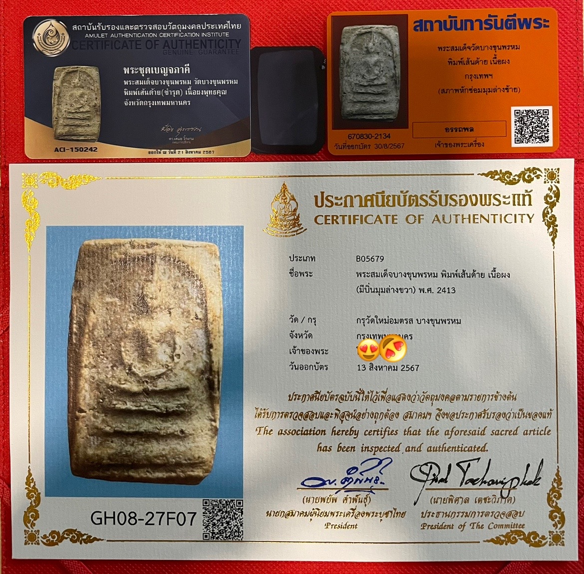 พระสมเด็จบางขุนพรหมกรุเก่า พิมพ์เส้นด้าย สวยงามมากชำรุดไม่ถึงองค์พระ ดูง่ายพร้อมบัตรรับรองสมาคมและAIC พร้อมฟิมส์x-ray ติดรางวัลที่4งานศูนย์ราชการ 6-10-67