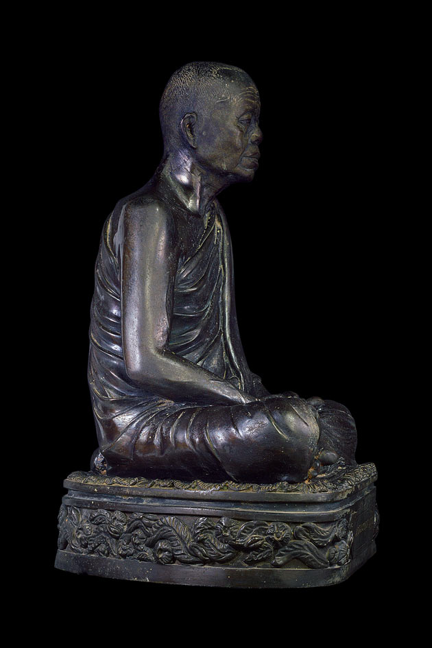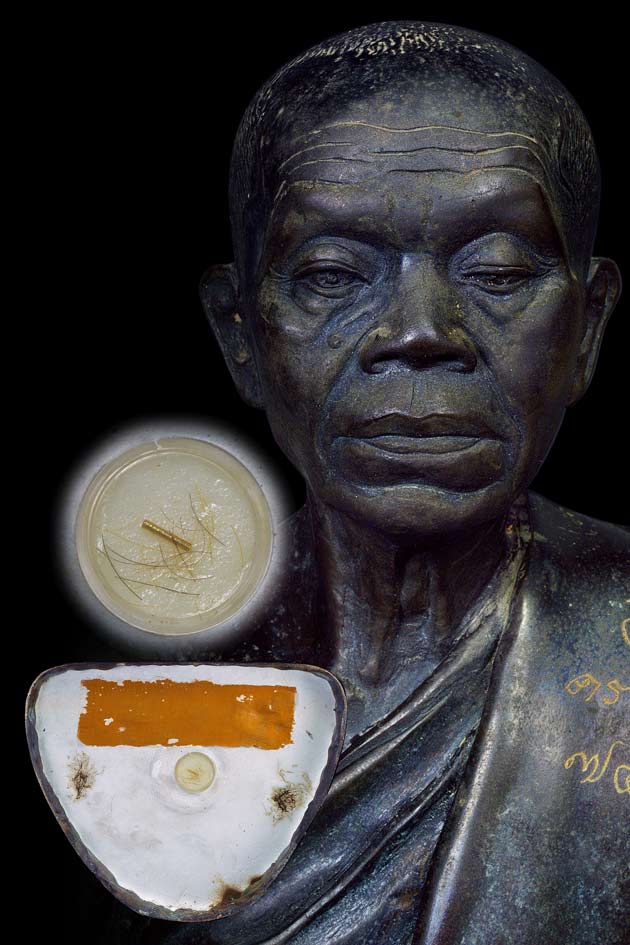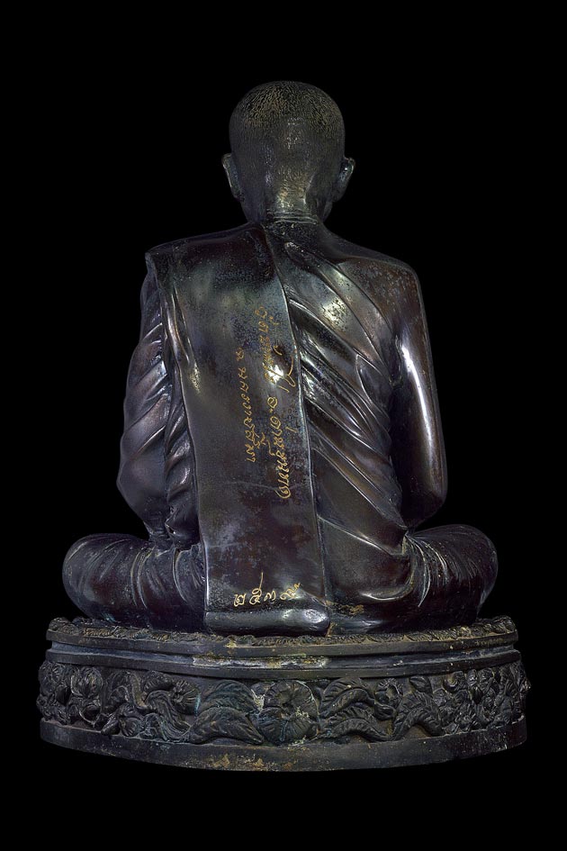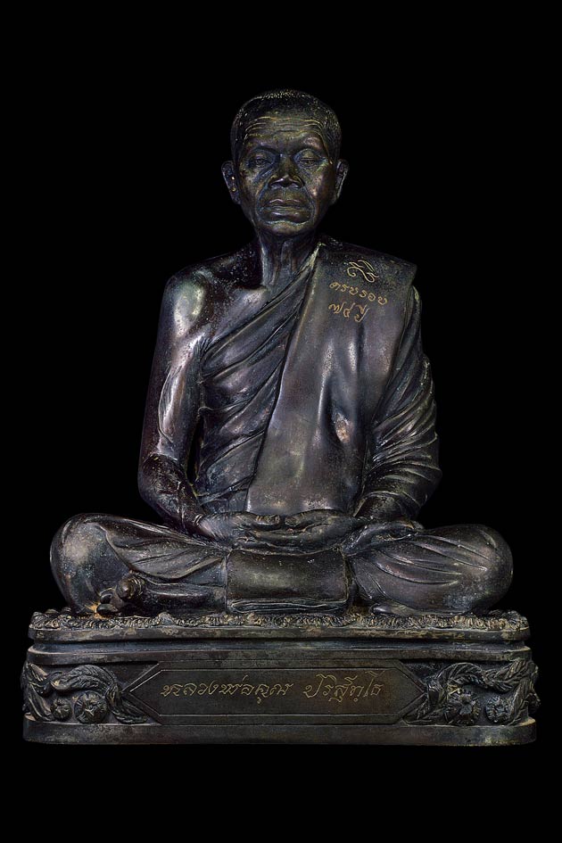 | พระบูชารูปเหมือนนั่งสมาธิ 9 นิ้ว รุ่น อายุครบรอบ 74 ปี ( เนื้อโลหะรมน้ำตาล ) พ.ศ. 2539 ( ใต้ฐาน ฝังตลับสีผึ้งมีเกษาตะกรุดทองคำฝังท้องแขน , แปะจีวร , ฝังยาเส้นหลวงพ่อคูณ , ปั้มตราวัดลางๆ) |