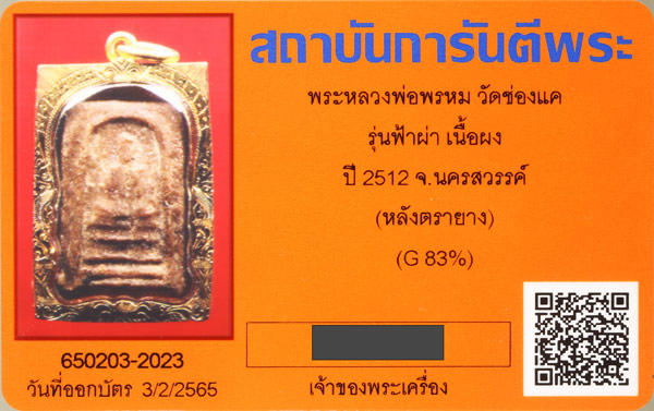 พระผงรูปเหมือนฟ้าผ่า หลวงพ่อพรหม วัดช่องแค เนื้อน้ำตาล(เข้ม) ปี2512 สภาพสวย มวลสารจัดจ้าน เลี่ยมกรอบทองเปอร์เซ็นต์สูง(ผลเปอร์เซ็นต์ทอง83%)(กรอบทองหนัก 6.73กรัม กรอบทองทำมาเกือบ 2หมื่น) พระผงรูปเหมือนรุ่นแรกที่หลวงพ่อพรหมท่านสร้างด้วยตัวท่านเอง เริ่มจากแกะพิมพ์ หามวลสาร ควบคุมการกดพิมพ์พระทุกขั้นตอน เป็นรุ่นที่ท่านตั้งใจทำมาก มวลสารที่ใช้ผสมในการจัดสร้างพระผงรูปเหมือนรุ่นนี้ไม่ธรรมดา เป็นของวิเศษในตัว รวมทั้งของใช้ของหลวงพ่อด้วย พุทธคุณรุ่นนี้มีให้เห็นเด่นชัดตั้งแต่เริ่มสร้าง เรียกว่าสร้างเสร็จก็มีประสบการณ์ให้เห็นเป็นที่ประจักษ์ทันที...