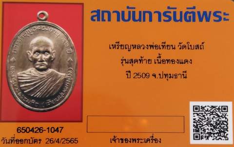 เหรียญหลวงพ่อเทียน วัดโบสถ์ ฉลองอายุ 91ปี รุ่นสุดท้าย เนื้อทองแดง ปี 2509 จ.ปทุมธานี หลังยันต์ครูพินทุมอญ วะ พะ ธะ จะ พร้อมบัตรรับรองครับ กองกษาปณ์แกะแม่พิมพ์ถวาย สร้างก่อนหลวงพ่อมรณภาพ ทุกเนื้อที่ปั๊มออกมา จะมีเส้นรัศมีวงกลมล้อมรอบหลายชั้น ตรงใต้คาง หรืออยู่บริเวณจีวรของท่าน สามารถเห็นได้ด้วยตาเปล่า ซึ่งปรากฏการณ์ดังกล่าวไม่ได้เกิดขึ้นจากการปั๊มหลาย ๆ เหรียญแล้ว วงการพระเรียกพระรุ่นนี้ว่า เหรียญบล็อกวงเดือน