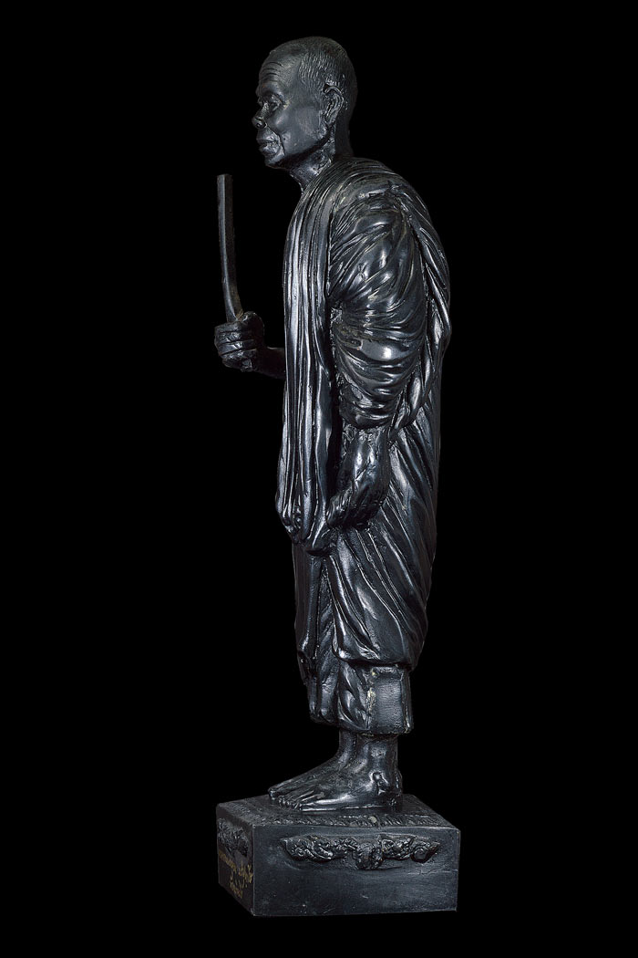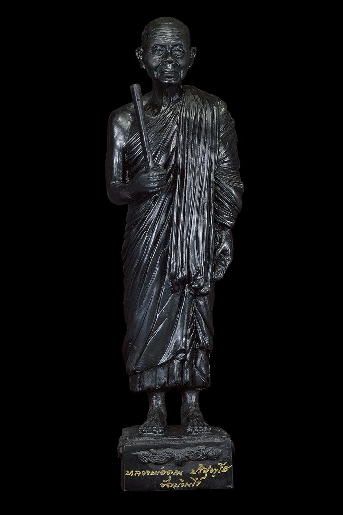 | พระบูชารูปเหมือนยืน ( ถือไม้เคาะศีรษะ , สูง 12 นิ้ว , ฐาน 3 นิ้ว ) อยู่ไหนก็รวย แผ่บารมี หลวงพ่อคูณ ปริสุทฺโธ วัดบ้านไร่ ( เนื้อโลหะรมดำ ) พ.ศ.2539 ( ใต้ฐานฝังเหรียญนั่งยองขอบสตางค์ รุ่น สร้างบารมี พ.ศ 2539 ) / ผู้จัดสร้าง พระปลัดไวพจน์ กตปุญฺโญ ( เจ้าอาวาส ) วัดสามง่าม ต.ลำโพ อ.บางบัวทอง จ.นนทบุรี / ปลุกเสก วาระ 1 หลวงพ่อคูณ ปลุกเสกเดี่ยว วันที่ 23 เมษายน พ.ศ.2539 / ปลุกเสก วาระ 2 ณ อุโบสถวัดสามง่าม อ.บางบัวทอง จ.นนทบุรี พระเทพประสิทธิ์คุณ เจ้าอาวาสวัดระฆังโฆสิตาราม ( ประธานจุดเทียนชัย ) , หลวงพ่ออุตตมะ เจริญจิตภาวนา ปลุกเสกประคำ และ ประพรมน้ำพระพุทธมนต์ , พระสงฆ์ทรงสมณศักดิ์ เจริญพระพุทธมนต์ ล พระเกจินั่งปกอธิษฐานจิต , หลวงพ่อทองกลึง เจริญจิตภาวนา บวงสรวงบูชาเทพ ยคาอารักษ์ |