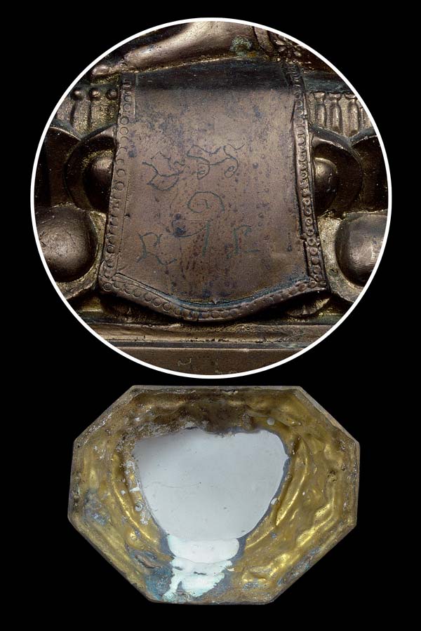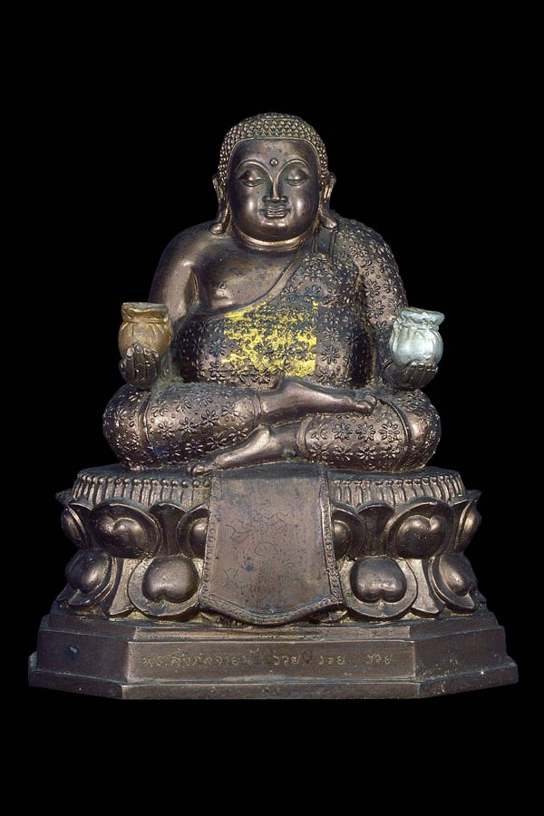 พระบูชา พระสังกัจจายน์ จีวรลายดอกพิกุล ( 5 นิ้ว ถือถุงเงิน-ถุงทอง ) รุ่น รวย รวย รวย พ.ศ.2538 ( จารยันต์อักขระ มะอะอุ นะ นะ ลายมือหลวงพ่อคูณ )