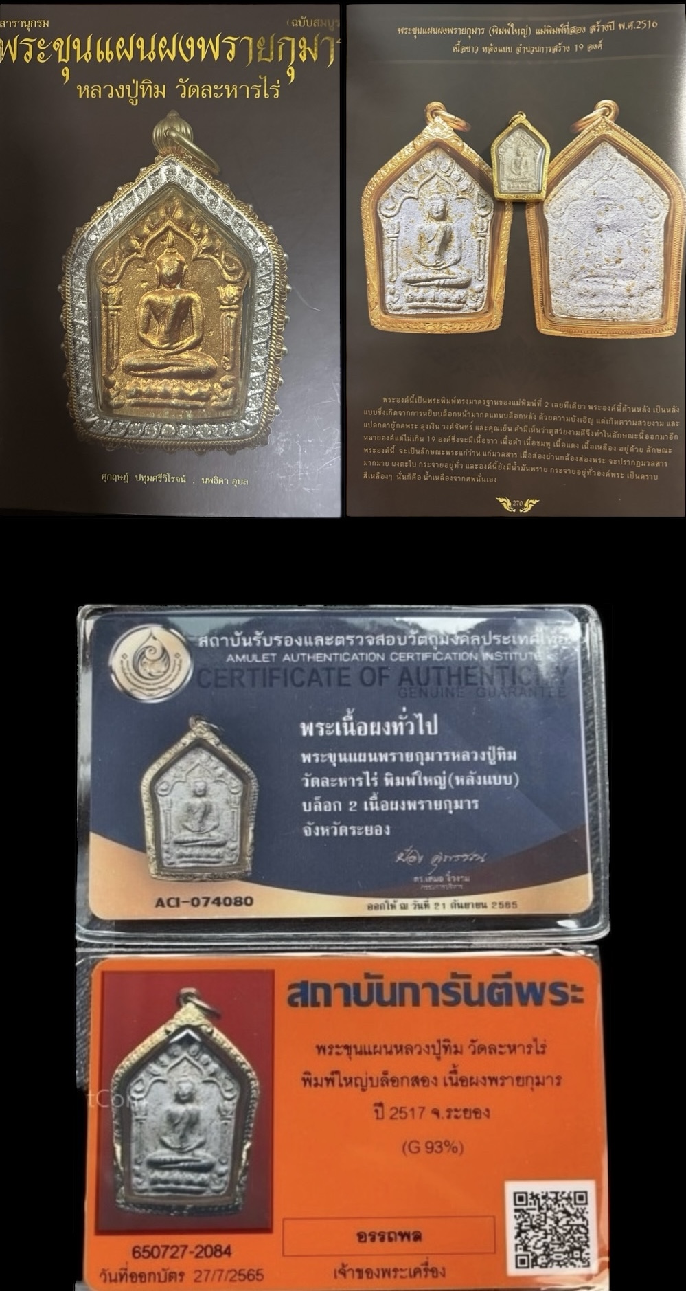 พระขุนแผนผงพรายกุมารหลวงปู่ทิมวัดละหารไร่ จ.ระะยอง ปี17 พิมพ์ใหญ่หลังแบบเนื้อขาวอมเหลือง(บล๊อกสอง)จัดสร้างน้อยมากๆที่สุด ตามบัณทึกมีเพียง19องค์ ของความหายากตัวจริงที่แท้และดูง่ายๆแบบนี้นานๆเจอที่ เป็นองค์ดาราในหนังสือ(สารานุกรม พระขุนแผนผงพรายกุมาร) ฟอร์มพระหนาบึกเลยหน้าหลังคมชัดลึกเนื้อจัดแก่ว่านแก่ผงพราย พิมพ์ทรงคมชัดสวยงาม ที่สุดของพระเนื้อผงของหลวงปู่ทิมท่านแล้วล่ะครับสำหรับผงพรายกุมารต้องลองใช้ดูแล้วจะรู้ว่าดีอย่างไร? พระแท้มาตราฐานสากล(เลี่ยมทองหนัก1บาทงานทองร้านพรประภา93%) สนใจจริงๆ☎️0818199820