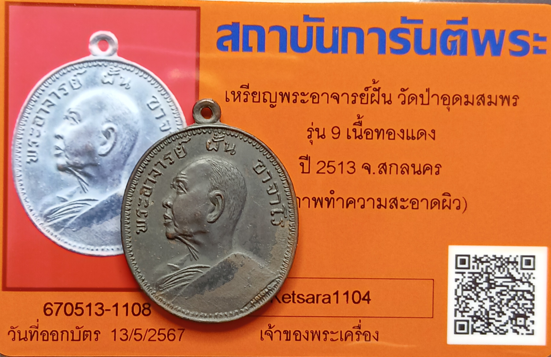 เหรียญพระอาจารย์ฝั้น รุ่น9 เนื้อทองแดง ปี2513 พร้อมบัตรรับรอง