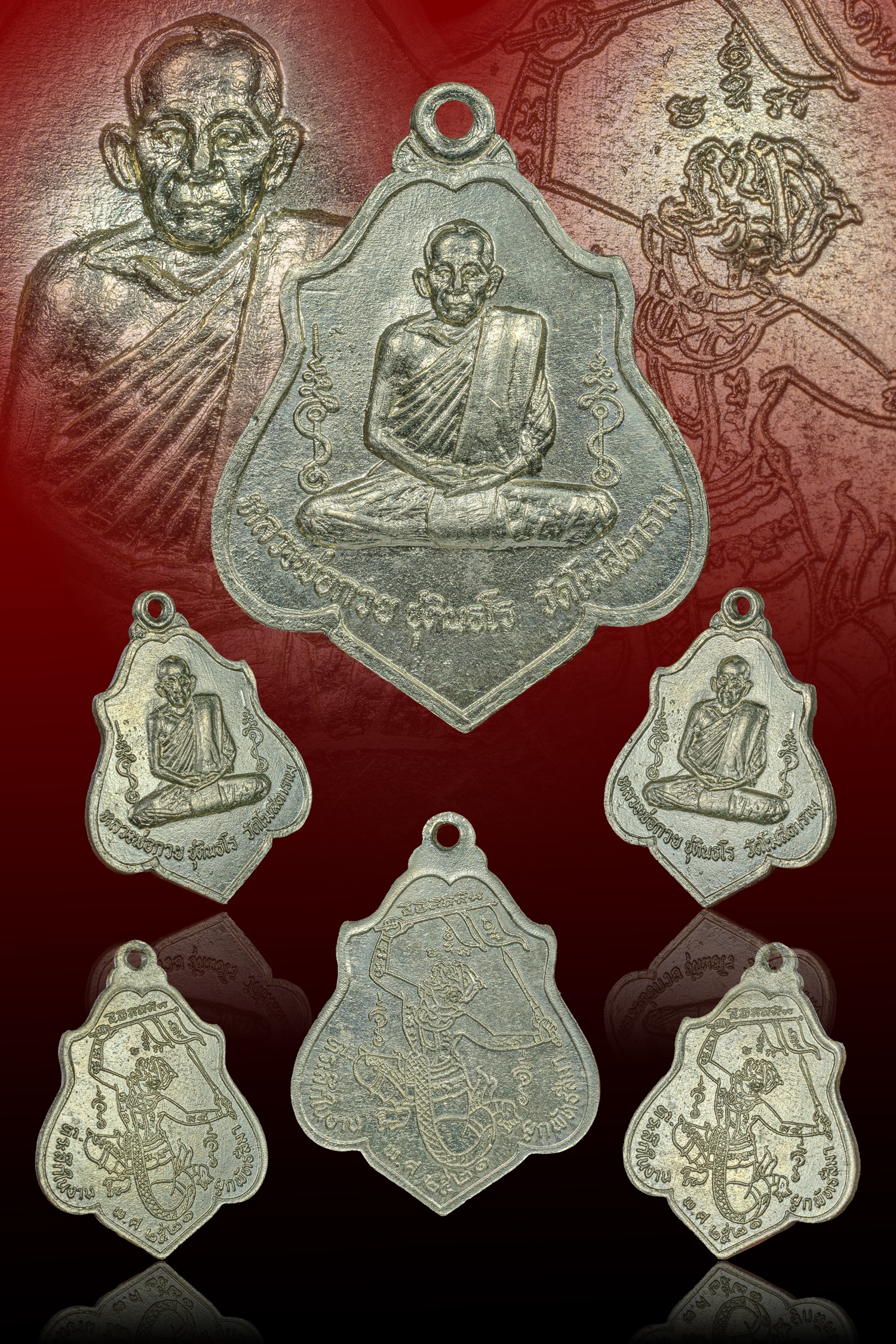 | ขอศิษย์ทั้งหลาย..."จงอย่าอดอย่าอยาก อย่ายากอย่าจน อย่าต่ำกว่าคน อย่าจนกว่าเขา" หลวงพ่อกวย ชุตินันธโร วัดโฆสิตาราม ท่านเกิดเมื่อวันที่ 2 พฤศจิกายน 2448 ปีมะเส็ง (มรณภาพเมื่อวันที่ 12 เมษายน 2522) ท่านเป็นเกจิที่โด่งดังอีกรูปหนึ่ง ที่ได้ยินชื่อเสียงมาอย่างยาวนาน เหรียญชุดนี้ออกให้ทำบุญเนื่องในโอกาสผูกพัทธสีมา และ ฝังลูกนิมิต ในปี 2521 มีทั้งหมด 3 พิมพ์ 1. พิมพ์หลังหนุมานเชิญธง เนื้ออัลปาก้า จำนวนการสร้าง 20,000 เหรียญ (นำมาทำกะไหล่ทองประมาณ 500 เหรียญ) 2. พิมพ์หลังยันต์ เนื้อทองแดง จำนวน 40,000 เหรียญ (นำมาทำกะไหล่ทองประมาณ 500 เหรียญ) 3. พิมพ์ทรงพุ่มข้าวบิณฑ์ เนื้อทองแดง จำนวน 10,000 เหรียญ ***เหรียญนี้เป็นเหรียญหลังหนุมานเชิญธง อรหํ ไม่เต็ม แต่ผิวพรรณ สวยมากมากครับ เดิมเดิม จมูกโด่งโด่ง*** |
