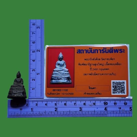 พระกริ่งอังคีรส พิมพ์สมาธิฐานสูง(ใหญ่) เนื้อทองเหลือง วัดราชบพิธฯ พ.ศ.2491 กรุงเทพฯ สภาพผิวมีคราบจาการเก็บ พร้อมบัตรการันตีรับรอง