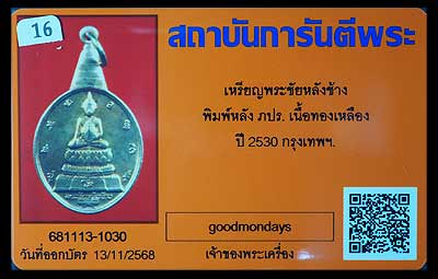 ชื่อพระ   เหรียญพระชัยหลังช้าง เนื้อทองเหลือง ปี2530 หลวงพ่อ
