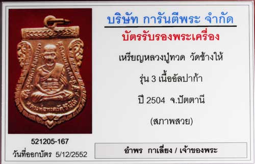 เหรียญหลวงปู่ทวด รุ่นสาม ปี2504 เนื้ออัลปาก้า กะไหล่เต็มๆ บางส่วนอาจจะบาง และบางส่วนอาจจะหนา บล็อคหน้า บล็อคเดียวกันกับบล็อคหน้า พ.ขีด นิยม บล็อคหลังเป็นบล็อคเงินลงยา หายาก และสภาพสวยมากๆ ครับ ผิวเดิม กะไหล่เต็มๆ จมูกโด่งทั้งหน้าหลัง พระหลวงปู่ทวดยุคอาจารย์ทิม หาสภาพสวยๆยากมาก บางรุ่นบางพิมพ์ใช้ว่ามีเงินจะหาบูชาได้ ไม่มีสภาพสวยให้เห็นบ่อยนักเพราะกาลเวลาผ่านมาเริ่มนานแล้ว องค์นี้กะไหล่เดิม วาวเต็มองค์ บล็อคนี้หายากครับ มีให้ชมทั้งรูปขนาดเล็กและขนาดใหญ่ บัตรรับรองระบุสภาพสวย ติดรางวัลที่1 งานพันทิพ 17-01-53