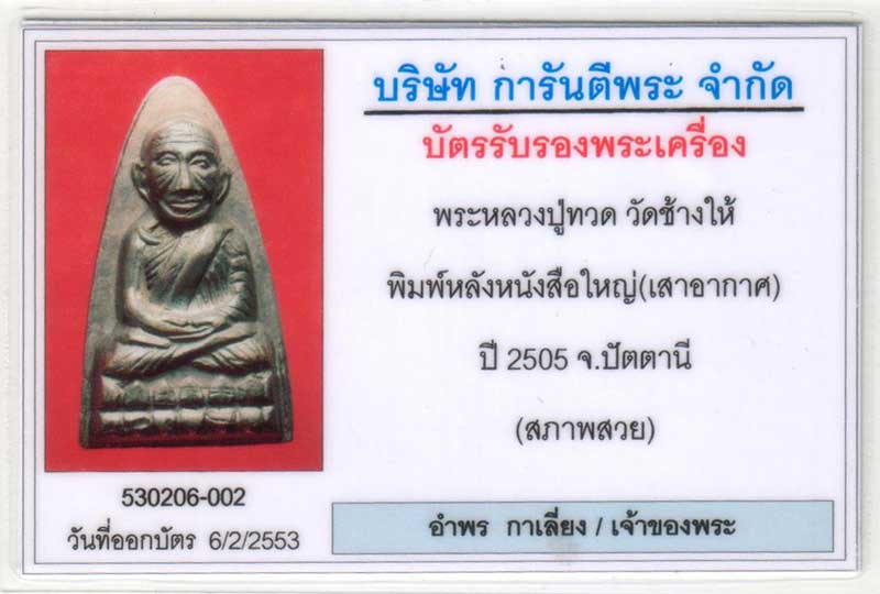 หลวงปู่ทวด วัดช้างให้ พิมพ์หลังหนังสือพิมพ์ใหญ่ ปี2505 บล็อคเสาอากาศ พิมพ์นี้เป็นพิมพ์คางขีดนิยม สำหรับพิมพ์คางขีดจะหาสภาพสวยๆเดิมๆ แบบนี้ยากมากๆๆๆๆ รมดำแห้งเก่าและเดิมแน่นอน ผิวปรอทเก่าจนเกิดประกายสีทอง จมูกโด่งมากเต็มรูปและสวย เดินสนามจนขาพันกันยังหาไม่เจอเลยกับพระเดิมๆ สภาพนี้ "พระแท้นั้นหายากครับ แต่พระที่สวยและเดิมๆ นั้นหายากกว่า" องค์นี้อยู่ในกลุ่มสวยเดิมจริงๆครับ กล้าพูดเต็มปาก ล่าสุดติดรางวัลที่2 งานพันทิพ 31-01-2553 ครับ งานนี้หินมาก เจ้ากรมหลวงปู่ทวดมาส่งหลายท่าน และอีกอย่างรายการนี้ประกวดรวมกับบล็อคหน้าบล็อควงเดือนบล็อคหลังเสาอากาศด้วย จึงได้มาแคที่2 บัตรรับรองระบุสภาพสวยครับ