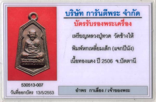 เป็นเหรียญหลวงปู่ทวดที่ไม่ได้สร้างแจกให้กับคนในเมืองไทย เหรียญหกเหลี่ยม แจกปีนัง เหรียญพิมพ์หกเหลี่ยมนี้มีทั้งพิมพ์ใหญ่และพิมพ์เล็ก มีปี พ.ศ.2506 บอกไว้ด้านหลังเหรียญ เป็นเหรียญพิมพ์แรกของวัดช้างให้ ที่บอกปี พ.ศ.ที่สร้าง ในเมืองไทยไม่มีให้เห็นมากนัก เพราะเหรียญพิมพ์นี้สร้างให้กับวัดไชยมังคลาราม ที่ประเทศมาเลเซียโดยเฉพาะ ลูกศิษย์ที่ติดตามไปและคนไทยในมาเลเซียเท่านั้นที่ได้รับแจก ไม่มีการแจกที่วัดอย่างเป็นทางการแน่นอน ด้วยเหตุนี้จึงพบเห็นน้อยมาก สภาพแบบองค์นี้ถือว่าสวยมากแล้วครับ เพราะหายากมาก สำหรับเหรียญนี้เป็นเหรียญหกเหลี่ยมพิมพ์เล็กครับ.............................................................................................. *****ชั่วโมงนี้ไม่มีออกมาให้เห็นเลยครับ และเหรียญนี้ติดรางวัลที่1 มาครับ