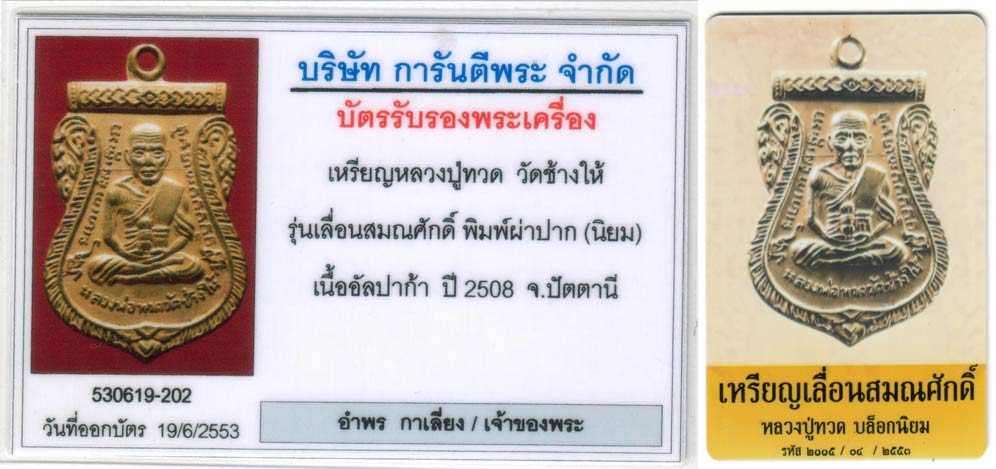 เหรียญหลวงปู่ทวด รุ่นเลื่อนสมณศักดิ์ ปี2508 เนื้ออัลปาก้า พิมพ์นิยม เป็นเหรียญที่ได้รับความนิยมอย่างมาก มีการกล่าวขานถึงประสพการณ์ หลายๆด้าน โดยเฉพาะเรื่องการเลื่อนยศ ตำแหน่ง เหรียญพิมพ์นี้ จะเป็นตัวตัดเดียวกันกับเหรียญพุฒซ้อน ปี2509 ซึ่งจะใช้ตัดเหรียญเลื่อนปี2508 ก่อน รายละเอียดดูได้ที่ ..................................................................................... https://www.g-pra.com/webboard/show.php?Category=real_amulets&No=195585 ............ เหรียญสภาพยังสมบูรณ์ ยาขัดเดิมๆ ยังมีอีกมาก ผ่านการโดนสัมผัสมาไม่มากนัก ............... บัตรรับรอง 2 สถาบันครับ ยืนยันความแท้ได้ 100 % ออกโดยเว้ปพระเครื่อง อันดับ1 และอันดับ2 ของโลกครับ
