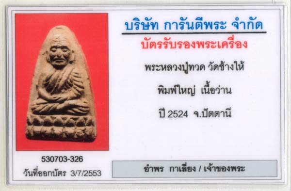 หลวงปู่ทวดเนื้อว่าน ปี2524 พิมพ์ใหญ่ กดพิมพ์ได้สมบูรณ์มาก เนื้อสวยมาก รอยรานแทบไม่มีให้เห็น มีบัตรรับรอง