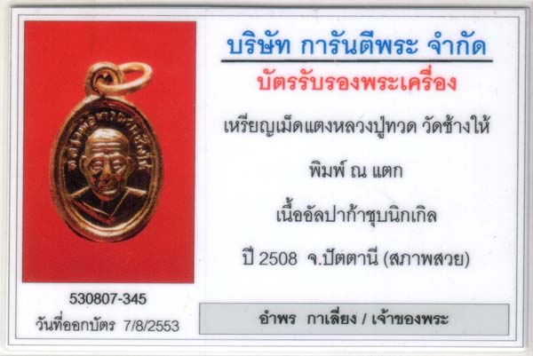 เหรียญหลวงปู่ทวด พิมพ์เม็ดแตง บล็อค ณ.แตก ปี2508 เนื้ออัลปาก้าชุบนิเกิล พระสภาพสวยมาก ไม่มีริ้วรอยตำหนิให้เห็น ปั๊มดีมาก หน้าตาสมบูรณ์ทั้งหน้าหลัง จมูกโด่งทั้งหน้าหลัง กะไหล่เต็ม 100% บัตรสภาพสวย ครับ