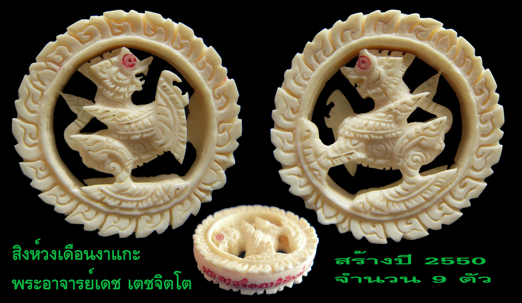 ....สิงห์วงเดือนงาแกะพระอาจารย์เดช เตชจิตโต..ท่านพระครูฯจัดสร้างถวายในปี2550..จำนวน 9 ตัว..สุดยอดครับสำหรับสิงห์วงเดือน สวยด้วยศาตร์และศิลป์...หายากมากๆใครมีใครก็หวงเป็นอีกรุ่นหนึ่งในเครื่องรางสายอ.เดชชุดงาแกะที่ผู้คนต้องการไว้ครอบครองมากที่สุด...มีของเก๊และทำเลียนแบบออกมามากครับให้ระวังกันไว้....