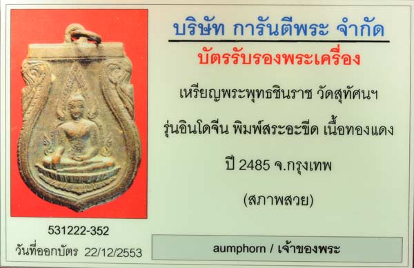 บัตรสภาพสวย..เหรียญพระพุทธชินราช 2485 สระอะขีด