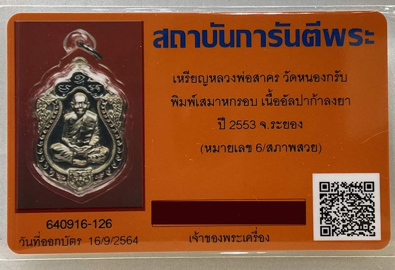 เหรียญสวยและได้รับความนิยมในรอบปี53 จะต้องมีเหรียญนี้ติดอันดับด้วยคือ....เหรียญเสมา6รอบหลวงพ่อสาคร วัดหนองกลับ.... องค์นี้เนื้ออัลปาก้าลงยา2สี..หมายเลข ๖...มาพร้อมบัตรรับรอง"สภาพสวย" .พระสวยคมมากๆไม่มีริ้วรอยใดๆให้สะดุดตาครับท่าน....