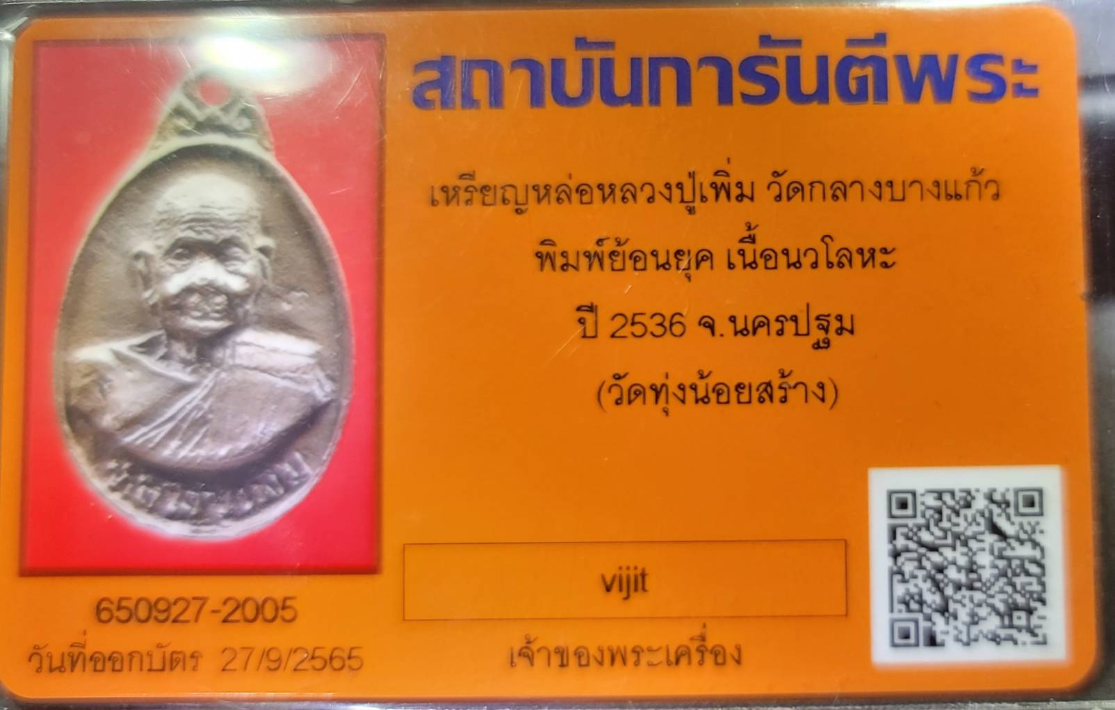 เหรียญหล่อหลวงปู่เพิ่มวัดกลางบางแก้ว เนื้อนวะ ปี2536ออกวัดทุ่งน้อย จ.นครปฐม มีบัตรรับรอง