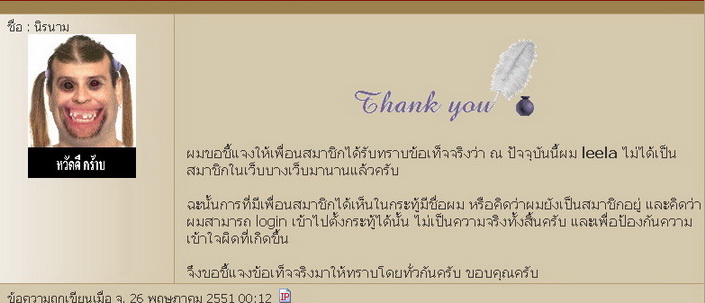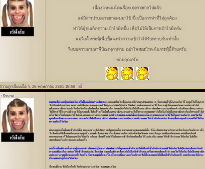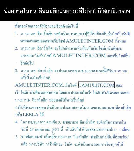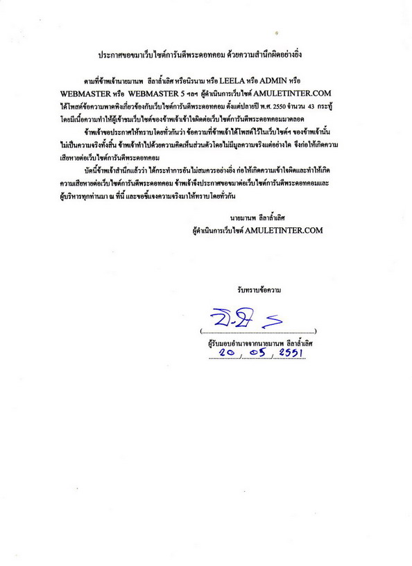 "ผมขอชี้แจงเพิ่มเติมครับ เพื่อป้องกันความสับสน ผมยอมรับในข้อตกลงที่ประกาศขอขมา 3 เว็บตามที่ได้ตกลงกันไว้ และก็ได้จัดการให้เป็นที่เรียบร้อย แต่การที่ใช้usernameผมที่ได้ถูกยกเลิกไปแล้ว ไม่มีการแจ้งบอกกล่าวไว้ในกระทู้ให้ทุกคนรับทราบนั้น ทำให้เพื่อนสมาชิกต่างเข้าใจผิดในเรื่องที่เกิดขึ้น โดยต่างคิดว่าผมนั้นได้กลับไปเป็นสมาชิกการันตีพระอย่างเดิมแล้ว ดังมีสมาชิกบางท่านได้โพสไว้ในกระทู้ และได้ถูกลบทิ้งไปแล้ว หรือมีเพื่อนสมาชิกหลายท่านได้โทรมาถามผมว่าได้กลับไปเป็นสมาชิกการันตีพระแล้วใช่หรือไม่ เพื่อที่ผมจะได้ไม่ต้องมาคอยถามที ตอบที จุดประสงค์ของผมก็คือเพียงแต่ต้องการบอกกล่าวให้ได้รับทราบกันว่า ผมไม่ได้ถูกปลดล็อค username และกลับไปเป็นสมาชิกการันตีพระอย่างเดิม ตามที่บางคนได้เข้าใจกันครับ จึงขอชี้แจงจุดประสงค์ให้ได้รับทราบกันไว้ครับ