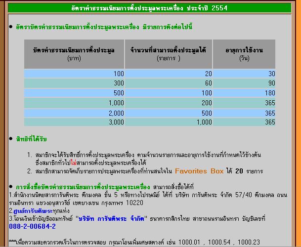 - ปรับปรุงค่าธรรมเนียมการทำใบรายงานผลและเก็บข้อมูลเป็น 200 บาทต่อพระเครื่อง 1 องค์ ( คิดเฉพาะพระเครื่องที่ออกผลแท้ออกบัตรฯได้กับพระเก๊เท่านั้น หากไม่ออกผลการตรวจสอบทางการันตีพระจะคืนค่าธรรมเนียมฯ 200 บาทนี้เป็นคูปองการันตีพระ แต่ถ้าออกผลเป็นพระแท้แต่ยังไม่ออกบัตรฯจะคืนค่าธรรมเนียมฯจำนวน 100 บาทเป็นคูปองการันตีพระ )