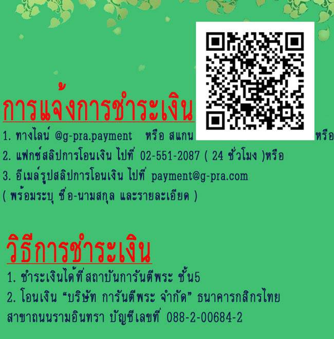 - ทางเว็บไซต์การันตีพระและสถาบันการันตีพระ ได้เพิ่มช่องทางในการแจ้งการชำระเงินถึง บริษัท การันตีพระ จำกัด อีกหนึ่งช่องทาง คือ ไลน์แอด @g-pra.payment