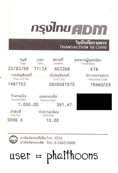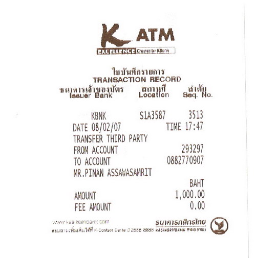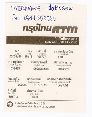 แจ้งการโอนครับ วันที่ 28-24-2550 เวลา 18.35 น. ครับ ยอด 1,000.
