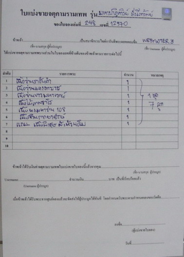 - รูปล่าง - เป็นรูปตัวอย่างการรับรอง *ใบแบ่งใบจองพระเครื่อง* โดยติดสติ๊กเกอร์โฮโลแกรมการันตีพระที่มุมบนขวาของใบแบ่งใบจองพระเครื่อง