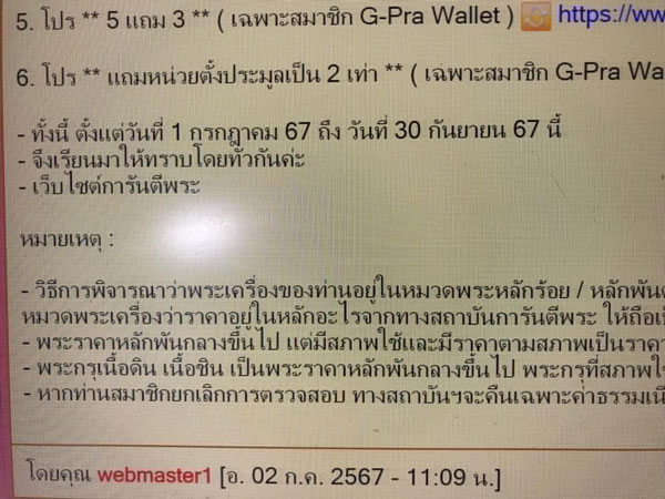 - ท่านสมาชิกที่เติมหน่วยตั้งประมูลมูลราคาตั้งแต่ 1000 บาทขึ้นไป ตั้งแต่วันที่ 1 ธ.ค 66 ถึง 31 ธ.ค 66 กรุณาแจ้งข้อมูลรายละเอียดการเติมหน่วยตั้งประมูลของท่านได้ที่ไลน์แอด @g-pra.payment ภายในวันที่ 15 ม.ค 67 นี้นะคะ ทางเว็บไซต์ฯจะพิจารณาชดเชยหน่วยตั้งประมูลที่เติมไว้และเหลืออยู่ถึงปัจจุบันนี้ให้ค่ะ