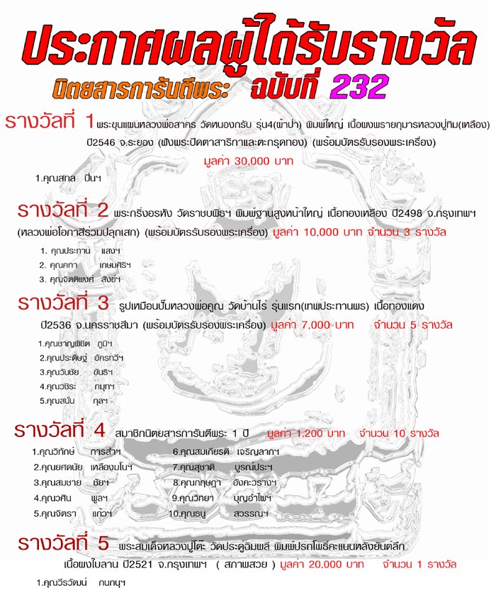 ประกาศผล ผู้โชคดีได้รับรางวัลของนิตยสารการันตีพระเดือนกันยายน ฉบับที่ 232