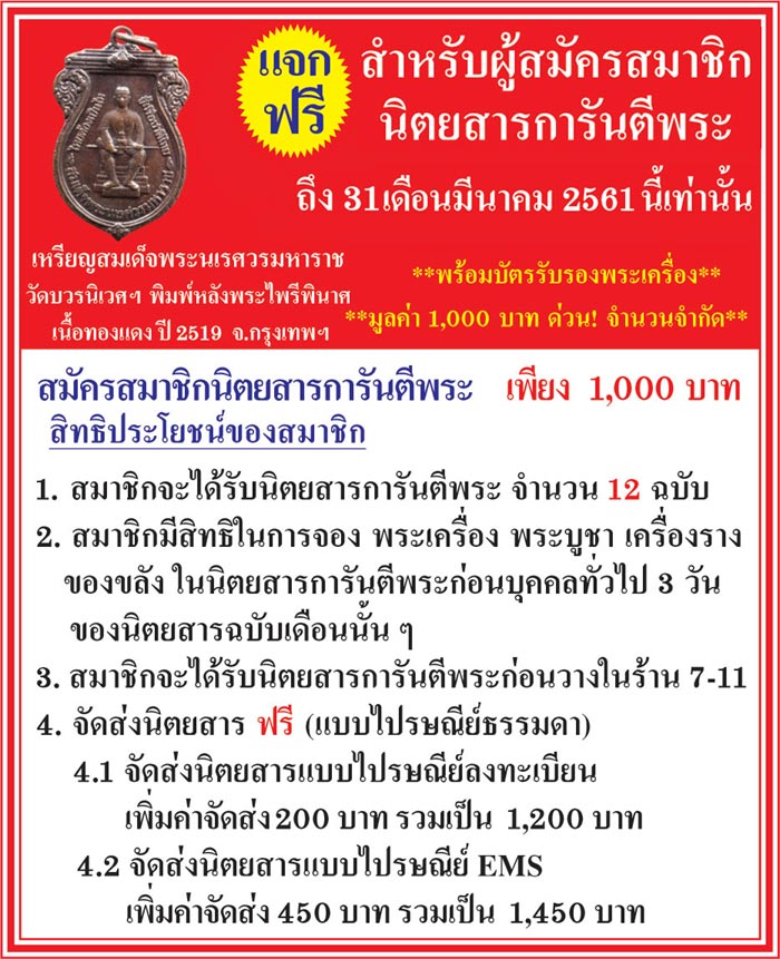 ** สำหรับผู้สมัครหรือต่ออายุสมาชิกนิตยสารการันตีพระ ในระหว่างวันนี้ ถึง 31 มีนาคม 2561 นี้เท่านั้น **