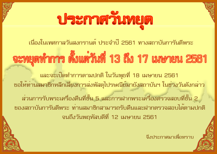 ประกาศวันหยุด เทศกาลสงกรานต์ประจำปี 2561