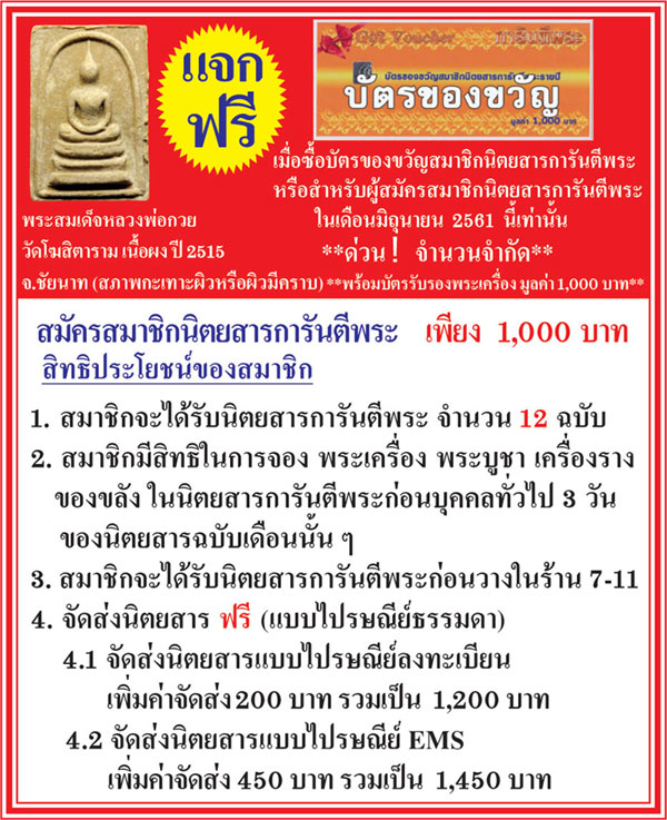 ** สำหรับท่านที่ซื้อบัตรของขวัญสมาชิกนิตยสารการันตีพระ และท่านที่สมัครหรือต่ออายุสมาชิกนิตยสารการันตีพระ ในระหว่างวันนี้ ถึง 30 มิถุนายน 2561 นี้เท่านั้น **