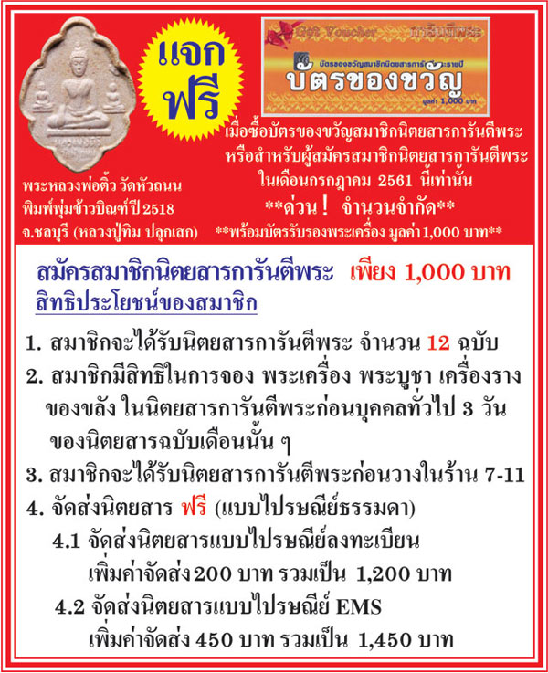 ** สำหรับท่านที่ซื้อบัตรของขวัญสมาชิกนิตยสารการันตีพระ และท่านที่สมัครหรือต่ออายุสมาชิกนิตยสารการันตีพระ ภายในเดือนกรกฎาคม 2561 นี้เท่านั้น **