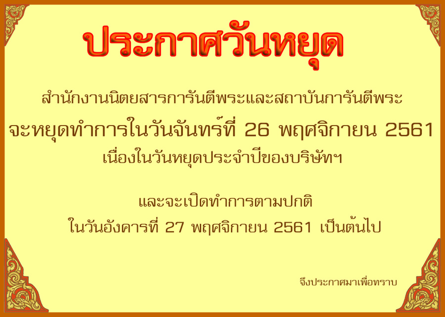 ประกาศวันหยุด 26 พฤศจิกายน 2561