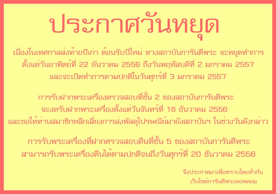 ประกาศ วันหยุดทำการในเทศกาลวันปีใหม่ประจำปี 2557