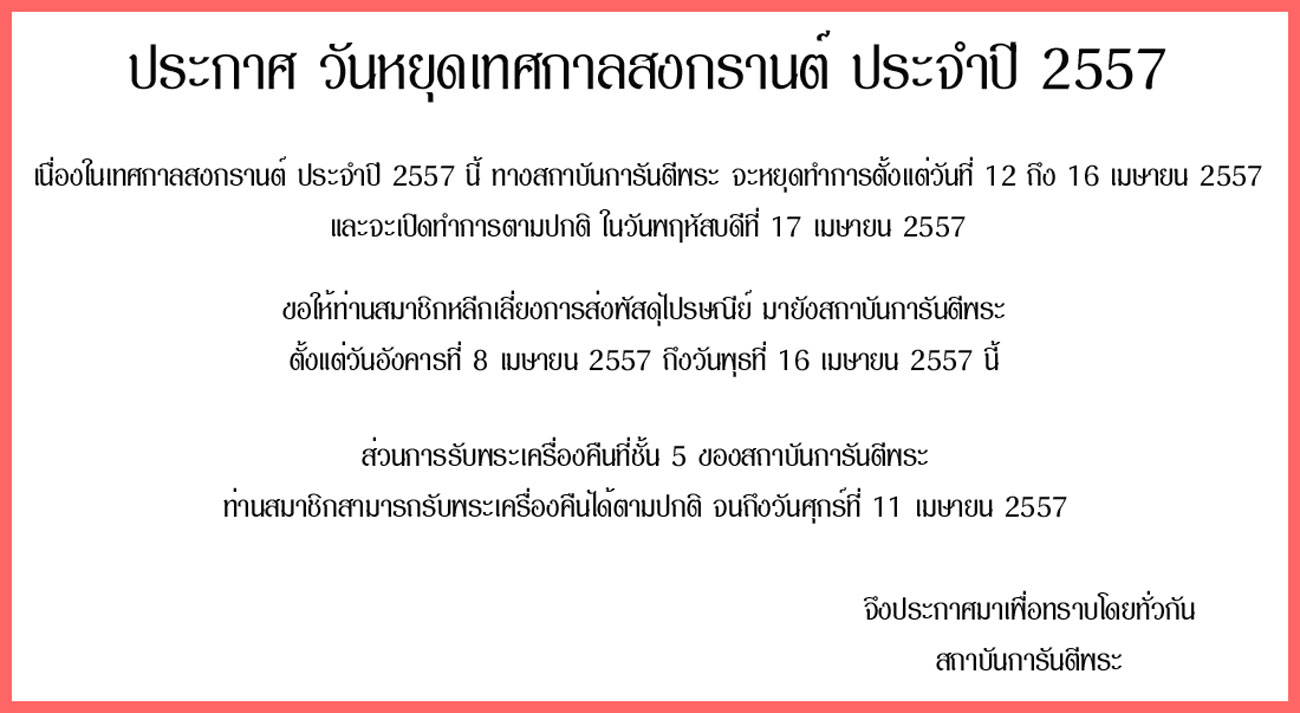 ประกาศ วันหยุดเทศกาลสงกรานต์ประจำปี 2557
