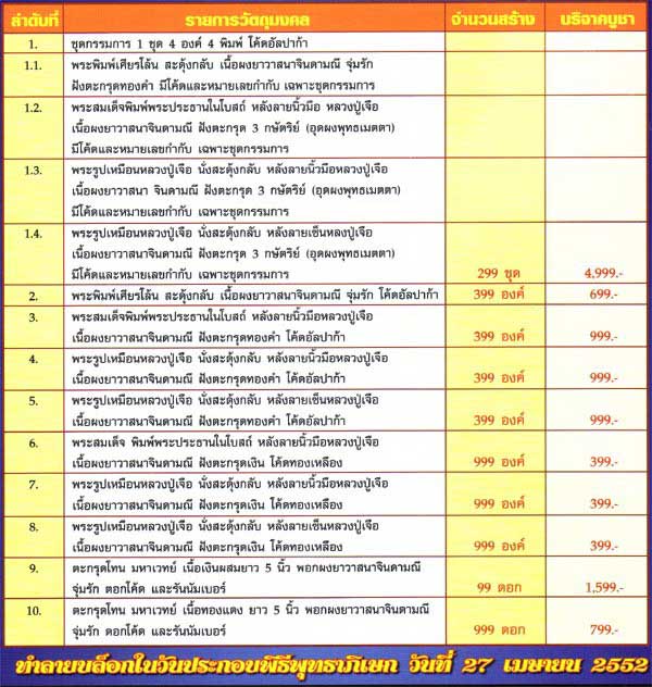 - รายการพระที่จะได้ จะเรียงตามลำดับการโพสต์จองตรงตามรายการพระ โดยเรียงลำดับ 38 รายการดังนี้