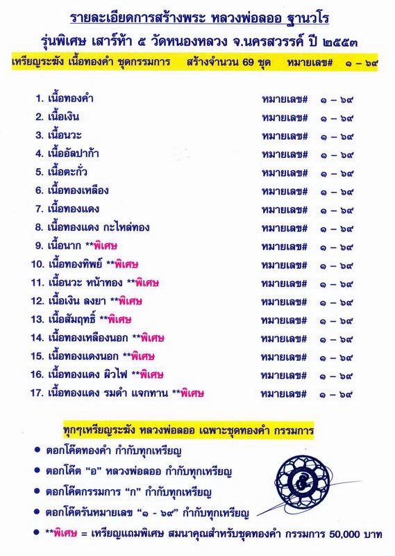 - ทุกศูนย์มีจะยอดเปิดจองจำนวน 5-7% จากจำนวนการสร้างทั้งหมด ของทั้ง เหรียญ ทุกเนื้อ และ รูปหล่อ ทุกเนื้อ