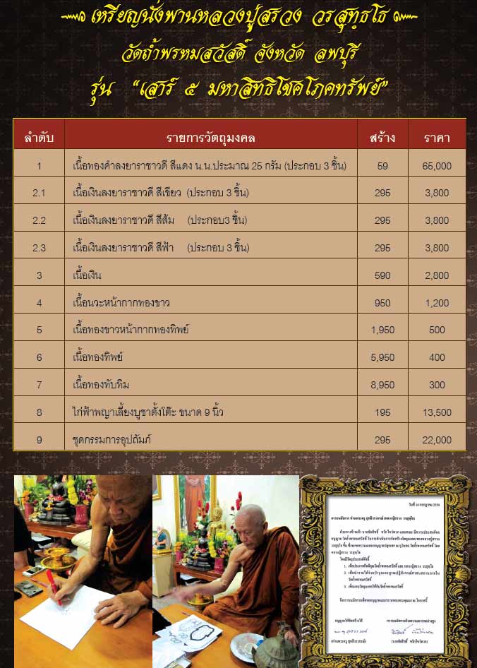 ได้เมตตาขอจัดสร้าง วัตถุมงคลหลวงปู่สรวง วรสุทโธ วัดถ้ำพรหมสวัสดิ์ เพื่อนำรายได้สมทบทุนโครงการต่างๆ ดังนี้