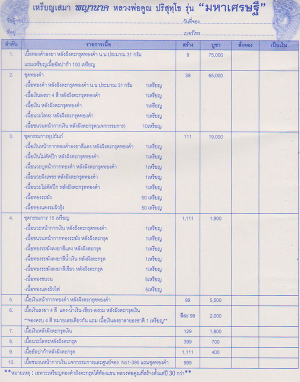ท่านที่ประสงค์ให้จัดส่งใบจอง และพระเครื่องทางไปรษณีย์ กรุณาเพิ่มค่าจัดส่งครั้งละ 100