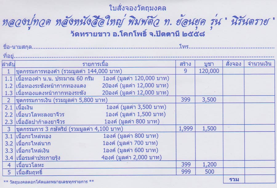ท่านที่ประสงค์ให้จัดส่งใบจอง และพระเครื่องทางไปรษณีย์ กรุณาเพิ่มค่าจัดส่งครั้งละ 100