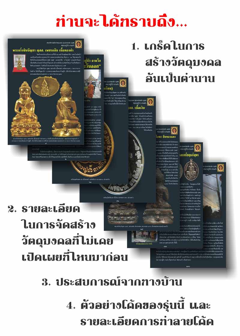 ปกแข็งอย่างดีหนา 150 หน้า มีภาพประมาณ 200 ภาพ ราคาเล่มละ 599.- บาท ค่าจัดส่ง EMS ทั่วประเทศเล่มละ 100.- บาท (ยกเว้นผู้ที่จะมารับหนังสือเองไม่ต้องเสียค่าส่ง) กำหนดสิ้นสุดวันรับจอง 29 กพ.55 พร้อมส่งมอบหนังสือประมาณวันที่ 10 มีค.55 ท่านที่จองรบกวนกรุณาโอนเงินเป็นเศษสตางค์ ตัวอย่างเช่น 699.05 บาทหรือ 699.11 บาท เป็นต้น เพื่อสะดวกในการตรวจสอบ พร้อมทั้งแจ้งชื่อและที่อยู่ที่ต้องการให้จัดส่งในกระทู้ด้วยครับ วัตถุมงคลชุดเพชรกลับ หลวงปู่บัว ถามโก นับได้ว่าเป็นวัตถุมงคลที่มีเอกสารครบถ้วนที่สุด นับตั้งแต่ครั้งแรกออกเอกสารการจองมีจำนวนสร้างและราคาชัดเจน ครั้งที่สองออกสุจิบัตรสรุปจำนวนการสร้างจำนวนที่แท้จริงและภาพในวันประกอบพิธีที่วัดพระแก้ว สุดท้ายครั้งที่สามเป็นหนังสือรวมเพชรกลับที่กำลังจะออกในเดือนมีนาคม 55 นี้ ทั้งหมดนี้ถือได้ว่าเป็นการออกเอกสารครบถ้วนกระบวนความที่สุด |