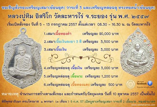 พรุ่งนี้แล้วครับ ขอเปิดฝากรับจองเหรียญเสมา และเหรียญหล่อฉลุ (ราคาวัด) ค่าบริการขอบวก 200 ทุกเนื้อ/เหรียญ (โอนเงินภายในวันที่ 4 ก.ค.57) ถ้าท่านใดบ้านไกลหรือไม่สะดวกไปจองผมเปิดฝากรับจอง- พร้อมจัดส่ง บรรจุกล่องส่ง EMS ให้ครับ