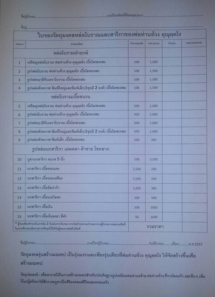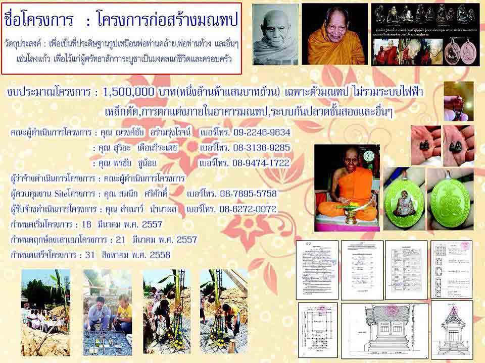 ทั้งนี้ ทางสำนักสงฆ์คลองแคว มีงบประมาณอยู่แล้วเป็นบางส่วน แต่ยังขาดปัจจัยอยู่ประมาณ 1,000,000 บาทเศษ จึงขอกราบเรียนเชิญผู้มีจิตศรัทธาทุกๆท่านร่วมจองวัตถุมงคลรุ่นสร้างมณฑป เพื่อร่วมเป็นส่วนหนึ่งของการทำนุบำรุงพระพุทธศาสนาสืบไปภายภาคหน้า และในโอกาสนี้ขออาราธนาคุณพระศรีรัตนตรัยและสิ่งศักดิ์สิทธิ์ทั้งหลายในสากลโลกจงดลบันดาลให้ท่านและครอบครัวประสพความสุข ความเจริญ สัมฤทธิ์ในสิ่งอันพึ่งปรารถนาทุกประการ |