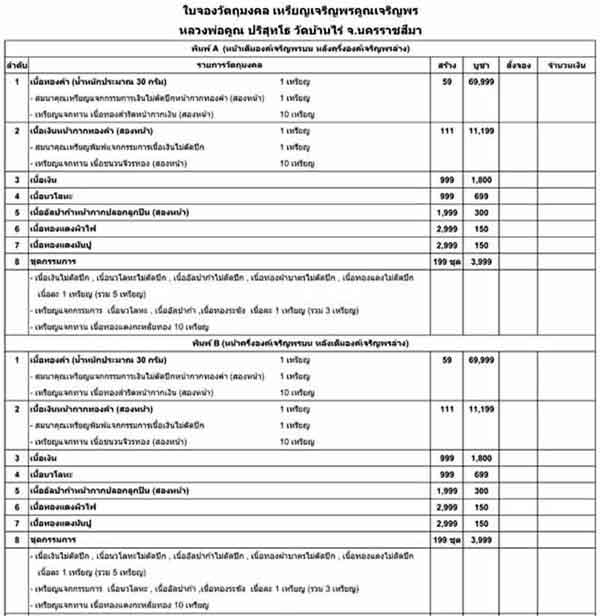 รายการ รุ่น ( เจริญพร "คูณ" เจริญพร ) หล่อหลอมเป็นหนึ่งเดียว @ จัดเป็นคู่ ( 1 คู่ ได้แก่ พิมพ์ A 1 เหรียญ และ พิมพ์ B 1เหรียญ)