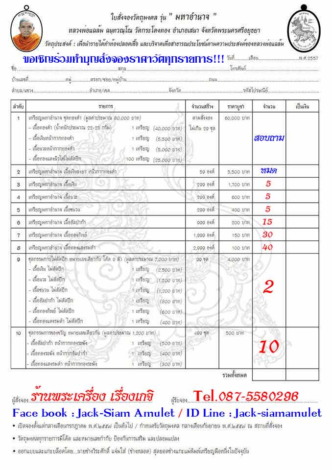 วัตถุประสงค์ : เพื่อนำรายได้ทำห้องปลอดเชื้อ และบริจาคเพื่อสาธารณะประโยชน์ตามความประสงค์ของหลวงพ่อแฉล้ม