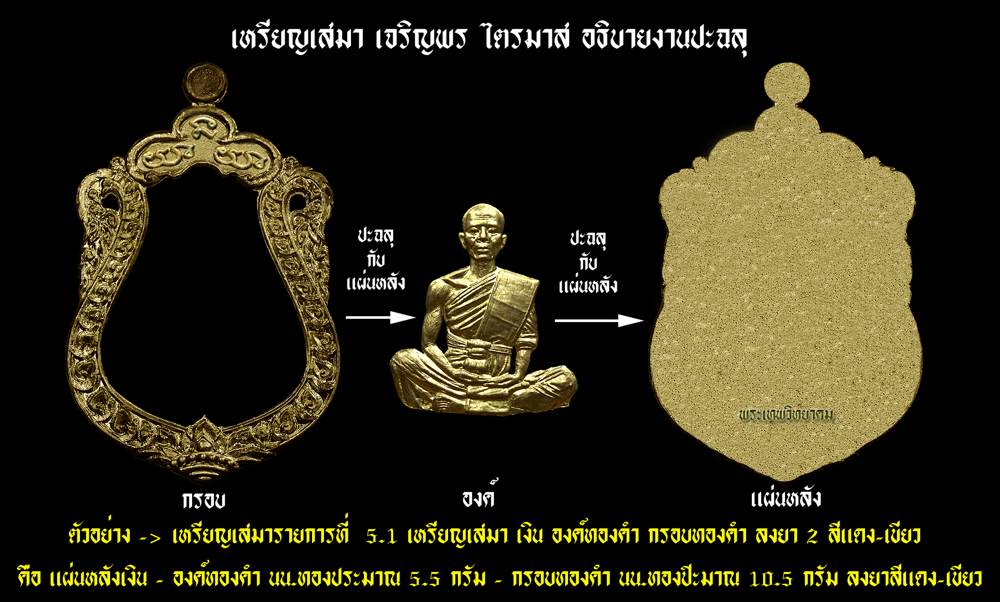 5.1 เสมาเงิน องค์ทองคำ กรอบทองคำ (ปะฉลุ3ชิ้น) ลงยา 2 สี (แดง-เขียว) นน.16 กรัม จำนวน 1 เหรียญ ราคาเหรียญละ 35,500 บาท